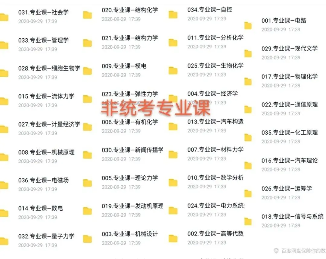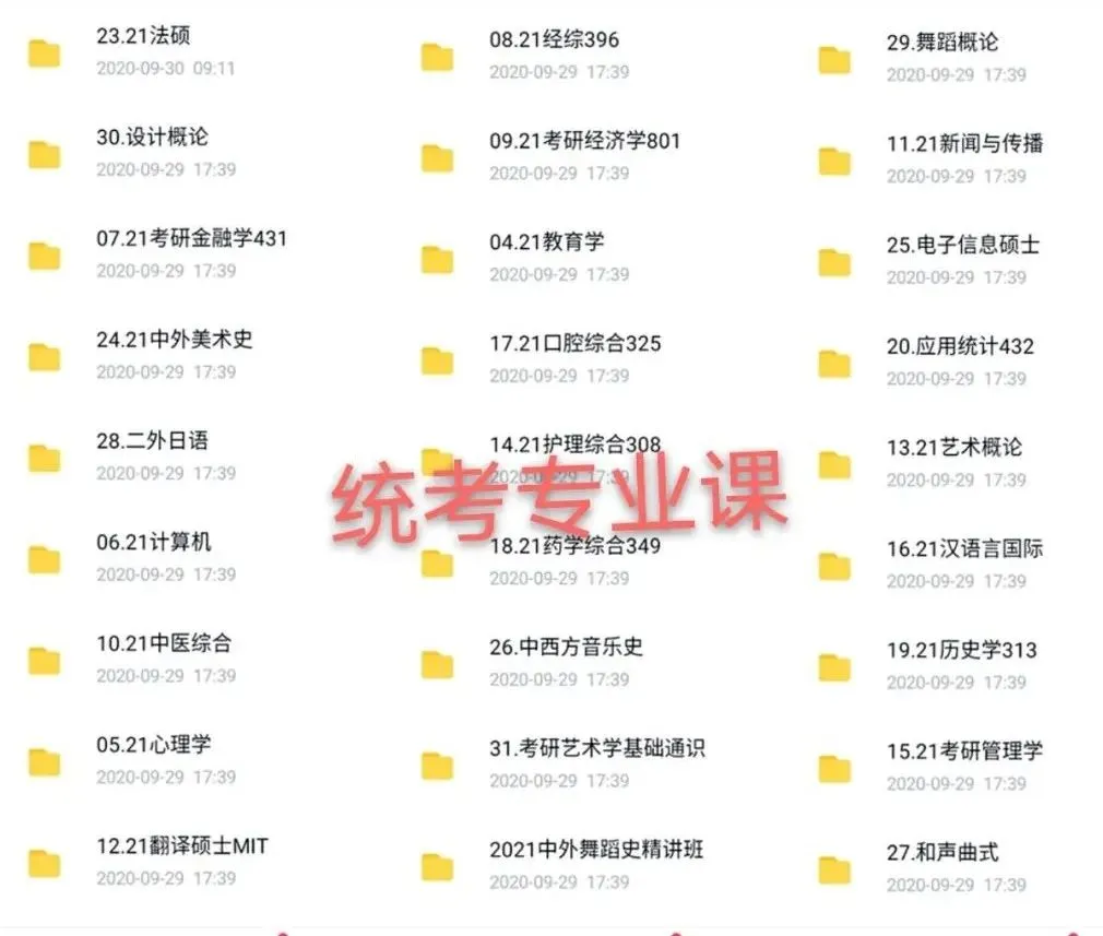 专业课资料包括统考专业课和非统考专业课,内含基础班+强化+冲刺等,包括名师视频课(含面授视频)及讲义。包括教育学、计算机、心理学、经济类联考、法硕、金融431等60多个科目,直接看下图!● 考研统考专业课