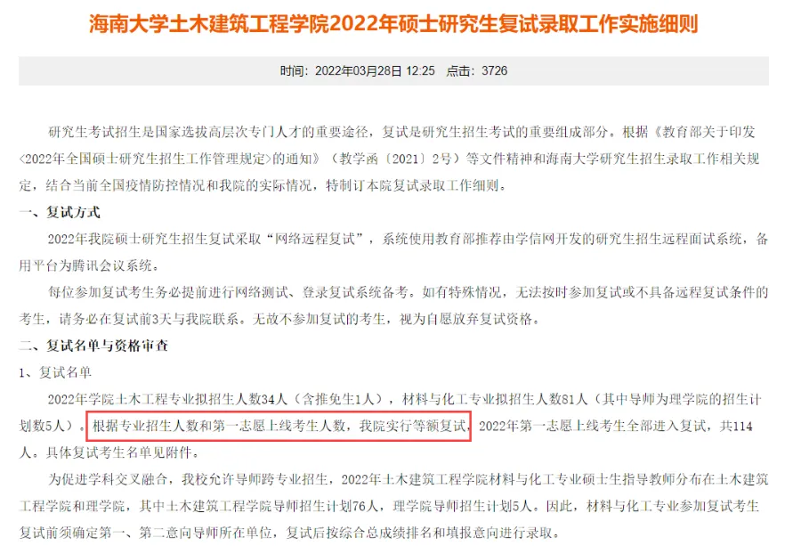 土木建筑工程学院发布的复试细则中就写明:我院实行等额复试,22年第一志愿上线考生全部进入复试。