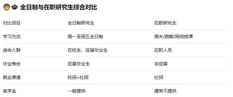 从整体来看,全日制研究生与在职研究生在学习方式、适合人群和毕业身份等方面有明显区别。