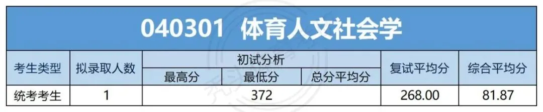 体育人文社会学一志愿全日制统考拟录取1人;拟录取总分372分。