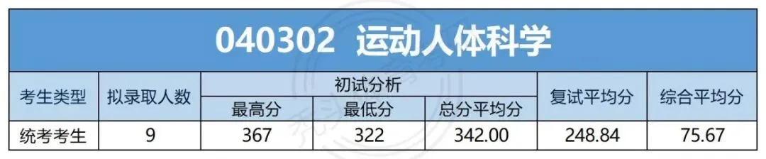 运动人体科学一志愿全日制统考拟录取9人,拟录取初试最高分400分,最低分344分,拟录取初试总分平均分360.6分。