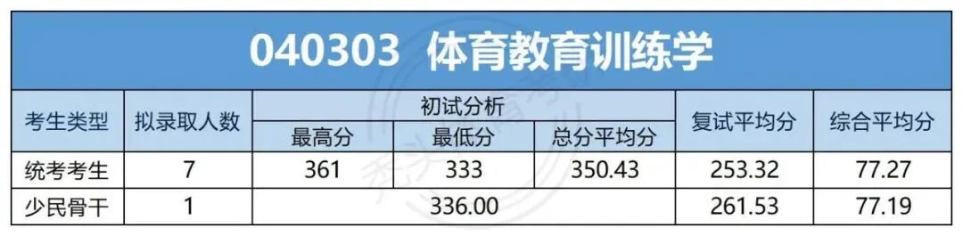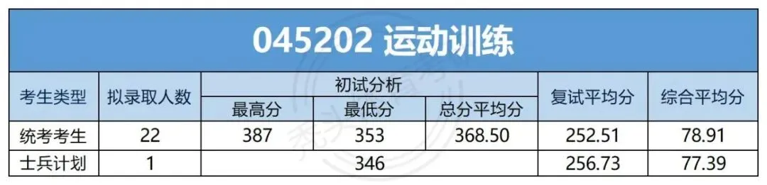 运动训练一志愿全日制统考拟录取22人;拟录取初试最高分387分,最低分353分,拟录取初试总分平均分368.5分。