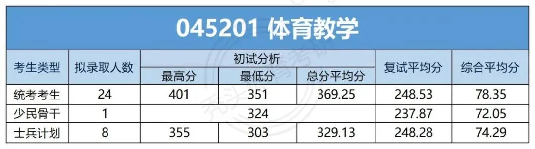 体育教学一志愿全日制统考拟录取24人;拟录取初试最高分401分,最低分351分,拟录取初试总分平均分369.25分。
