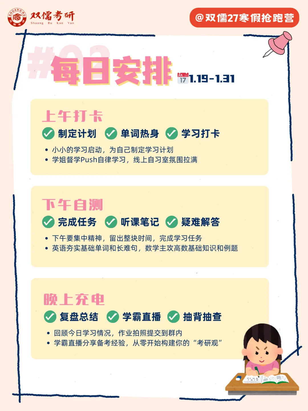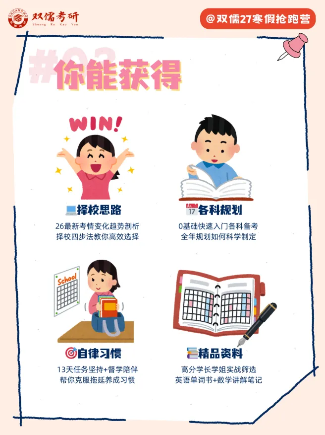 整整13天,内容我们都安排好了,你只管跟上节奏。每天进步一点点,收获的不仅是知识,更是高效学习的方法、思路和习惯,绝对超值!找学长学姐报名吧,一起赢在寒假起跑线!🚀