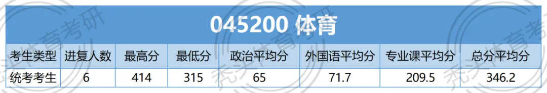 体育一志愿统考6人,各科目平均分为政治65、英语71.7、专业课209.5、总分346.2