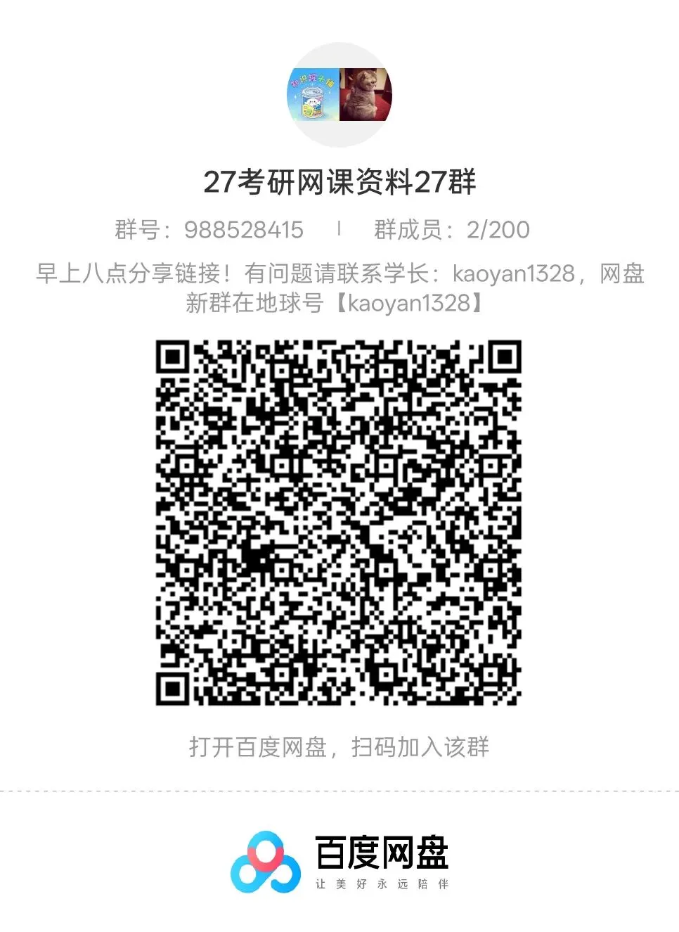 26考研网课资源都整理好了,考研人都在这个群里,我把整理好的考研资料都放在百度网盘群和夸克网盘了,每天同步更新电子资料和视频网课,有需要的宝子们赶紧扫码进群哦,群满或者有问题随时联系我:kaoyan1328