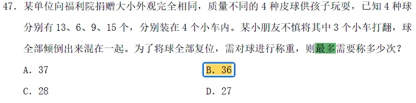 打翻3个小车,最多打乱13+15+9=28+9=37,最后 1 个球可通过排除法确定,无需额外称重