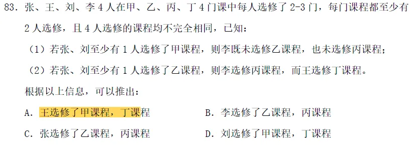 假设李未选修丙,→非(张或刘选乙)【张刘都不选修乙】→王且李选修乙→张和刘都不选修甲→王且李选修甲
