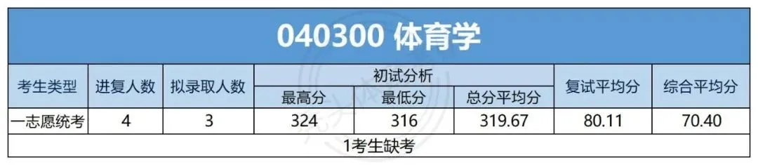 体育学专业一志愿统考复试4人,拟录取3人,拟录取率75%;拟录取初试最高分