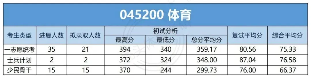体育硕士一志愿士兵计划统考复试2人,拟录取2人,拟录取率100%;拟录取初试最高分372分,最低分324分,初试总分平均分348分;