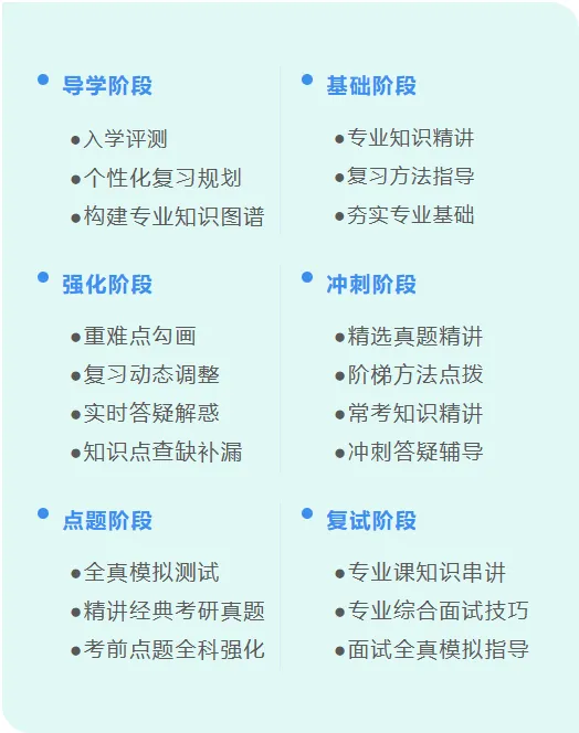 ⭕包括但不限于:为学员提供专业课复习提要、具体学习方法、预测把控各章节具体重难点及题型分析、各阶段复习方向...