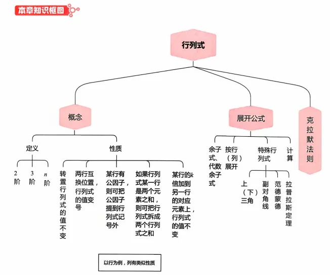 - 《复习全书基础篇》中的“行列式”章节知识框图。该图以“行列式”为中心,发散出“概念”、“展开公式”、“克拉默法则”等多个知识模块,每个模块下再细分为具体定义和要点。这种视觉化的梳理方式,能够帮你快速抓住章节的核心脉络,理清各知识点间的逻辑关系,告别零散记忆。