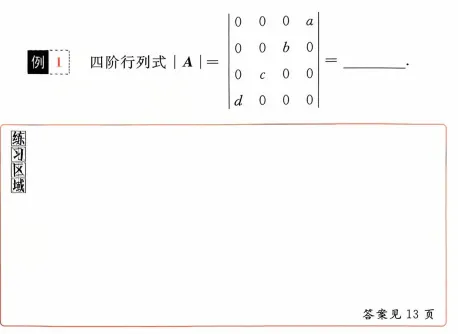 - 本书对经典例题的运用方法展示。书中特别设置了“学前预习”和“学后优练”两个功能区域,鼓励学生带着问题学习,并在学习后通过重做例题来检验是否真正掌握,最大化每一道经典题目的练习效果。图中以一道四阶行列式题目为例,清晰地展示了这一学习闭环。