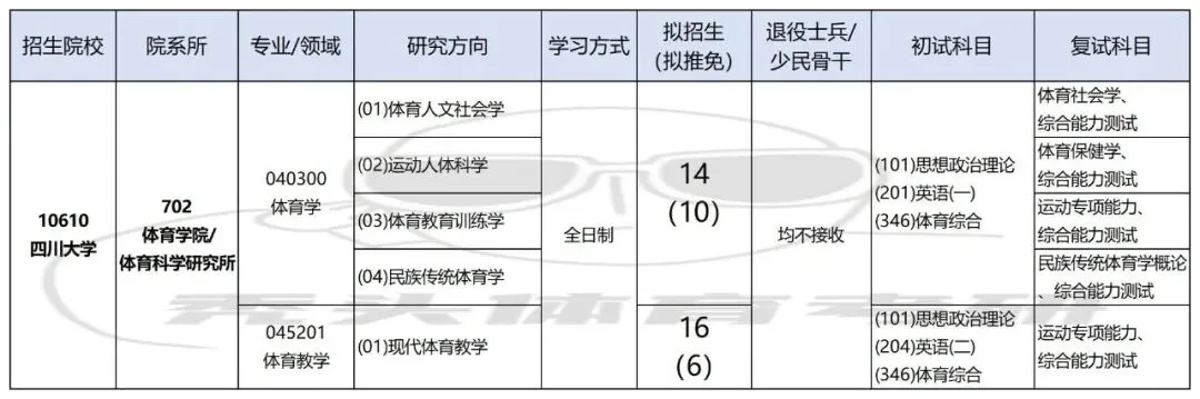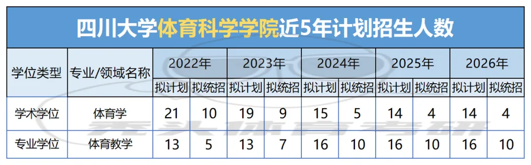 2026年四川大学体育学院/体育科学研究所拟招收全日制硕士研究生30名,体育学14人(统招4名),体育硕士16人(统招10名),最终招生人数以教育部正式批准计划数为准。