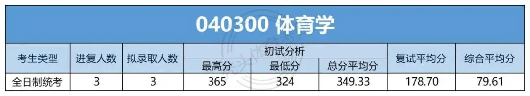 体育学一志愿全日制统考复试3人,拟录取3人,拟录取率100%;一志愿拟录取初试最高分365分,最低分324分,拟录取初试总分平均分349.33分。