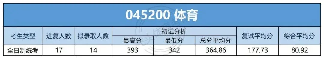 体育硕士一志愿全日制统考复试17人,拟录取14人,拟录取率82.35%;一志愿全日制拟录取初试最高分393分,最低分342分,拟录取初试总分平均分364.86分