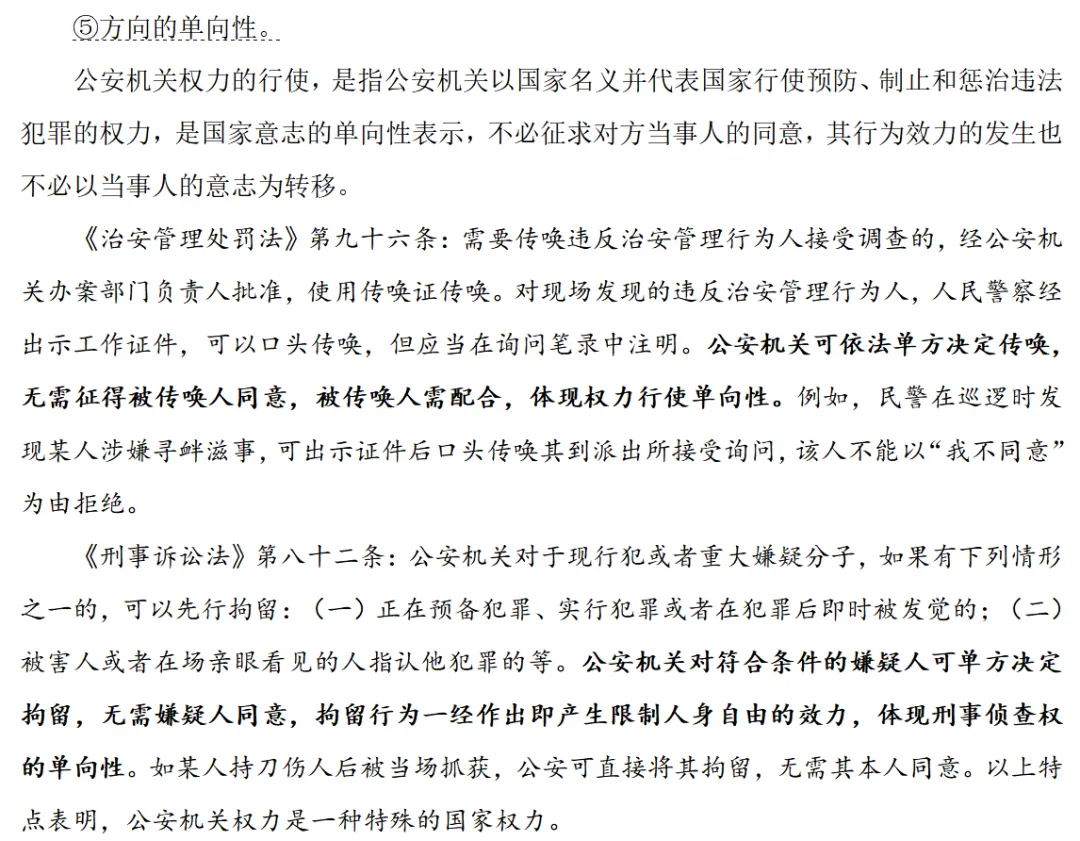 2.同样2025年12月初试的真题考法颇具特点,以 “简述公安机关权力行使的单向性特点” 这类题目为例,其既带有鲜明的教材核心考点直接考查特征,如同八股取士般,将教材视作备考根本,围绕书中特定段落、关键语句设题,扎实背诵教材核心内容便能拿到基础分值;同时又能充分凸显具备法律素养考生的优势——若仅靠死记硬背教材中的寥寥数语作答,远不足以答深答透,难以拿到高分。
