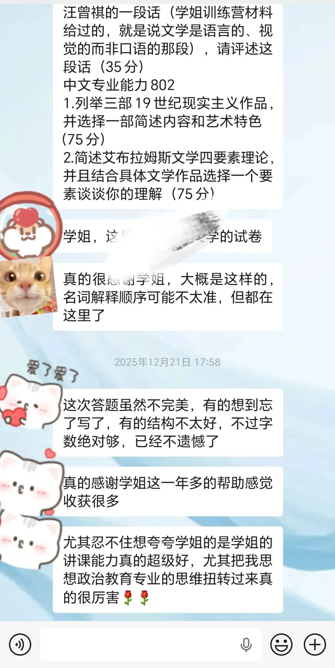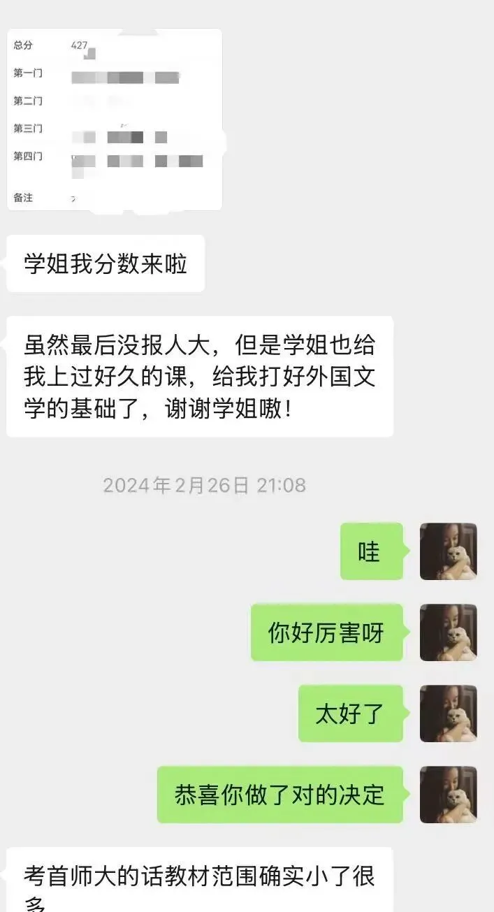 今年有不少同学咨询我有没有文学考研辅导,有的!今年会跟两位92上岸学姐一同开设全程辅导班,价格和课程服务透明。文学全程班:2199(原价2599,优惠价2199,截止至三月十号)人大文学全程班:3499(原价3699,优惠价3499,截止至三月十号)前一种文学全程班班型是普适性的,也会针对大家目标院校真题进行指导复习第二种文学全程班班型主要面向人大,增加大量人大真题讲解,人大重难点补充课程和考前全真模拟。有多年小班和一对一课程辅导经验,985初试高分,现当代初试400分第一名上岸。多年小班与一对一辅导经验,带出近年人大上岸学员。擅长现当代文学、文艺学、语言学,讲课逻辑清晰,善于打通学科壁垒。211高校外国文学方向,去年刚上岸,对文学考研初复试有最新鲜的实战感受,擅长外国文学脉络梳理与答题技巧点拨。985初试高分,文学基础135+,多年文学考研辅导经验,整理出多套高质量复习资料,授课耐心细致,已助力大量学员高分上岸。一些同学跟我还是第一次见面,有些同学已经认识我很久啦,在做了三年一对一文学考研辅导后,去年是更多朋友认识念文的一年。从24年三月的名词解释训练营,到四月的基础班,七月后各科训练营陆续顺利展开,九月作家专题班,十一月的冲刺课,十二月的模拟卷……有很多同学也参与了年初的初试作品研读课,26文学考研全程班和现当代、外国、古代、文论训练营~全程班均为小班制,均包括相应学科的督学,答疑和课程学习,下面分别介绍一下课程服务体系。