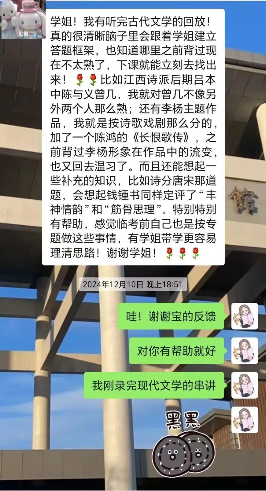 学姐会搭配陆俭明、朱德熙等老先生的专著讲解重要知识点:比如“台上唱着戏”和“台上坐着主席团”的区别,分专题讲解重难点知识。