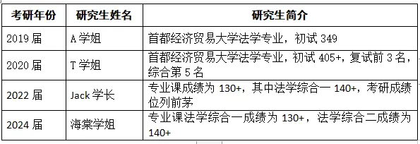 海棠学姐,考研初试成绩位列前茅,专业课法学综合一成绩为130+、法学综合二成绩为140+,本科知识产权法学,通过四六级,绩点排名专业前十。