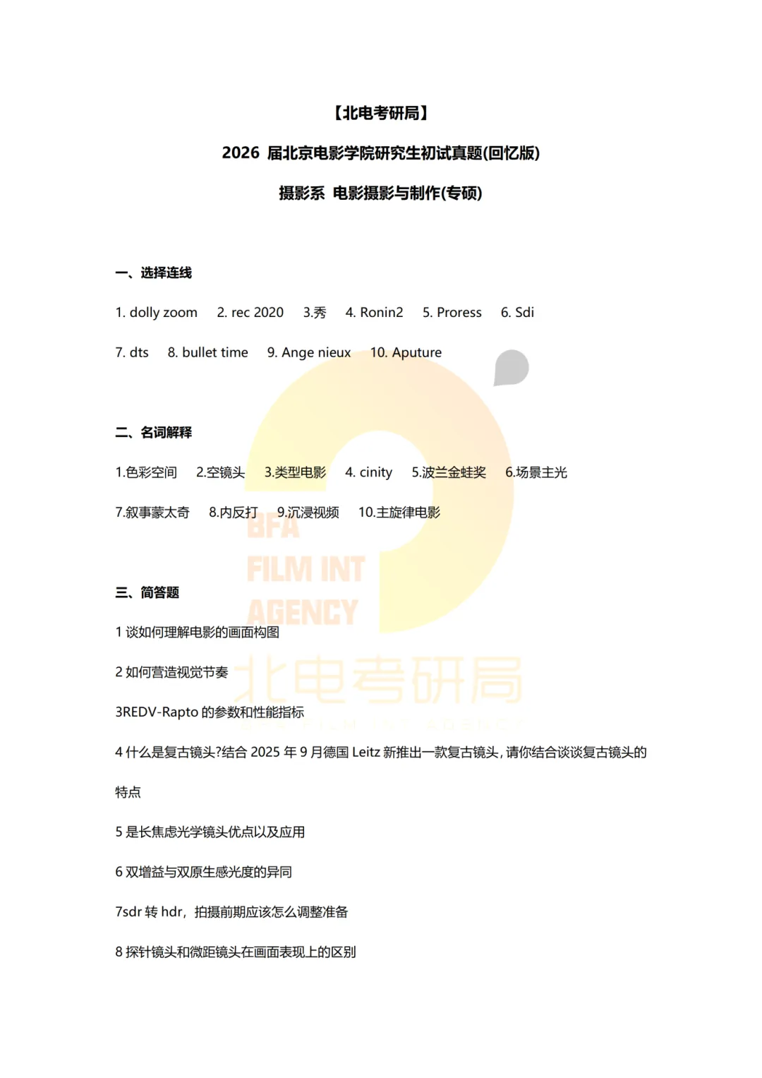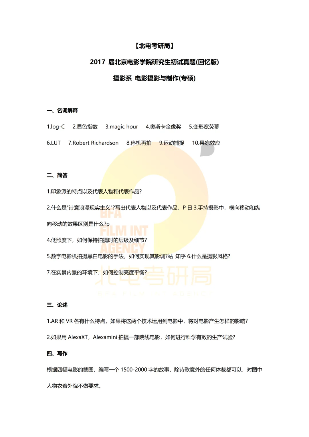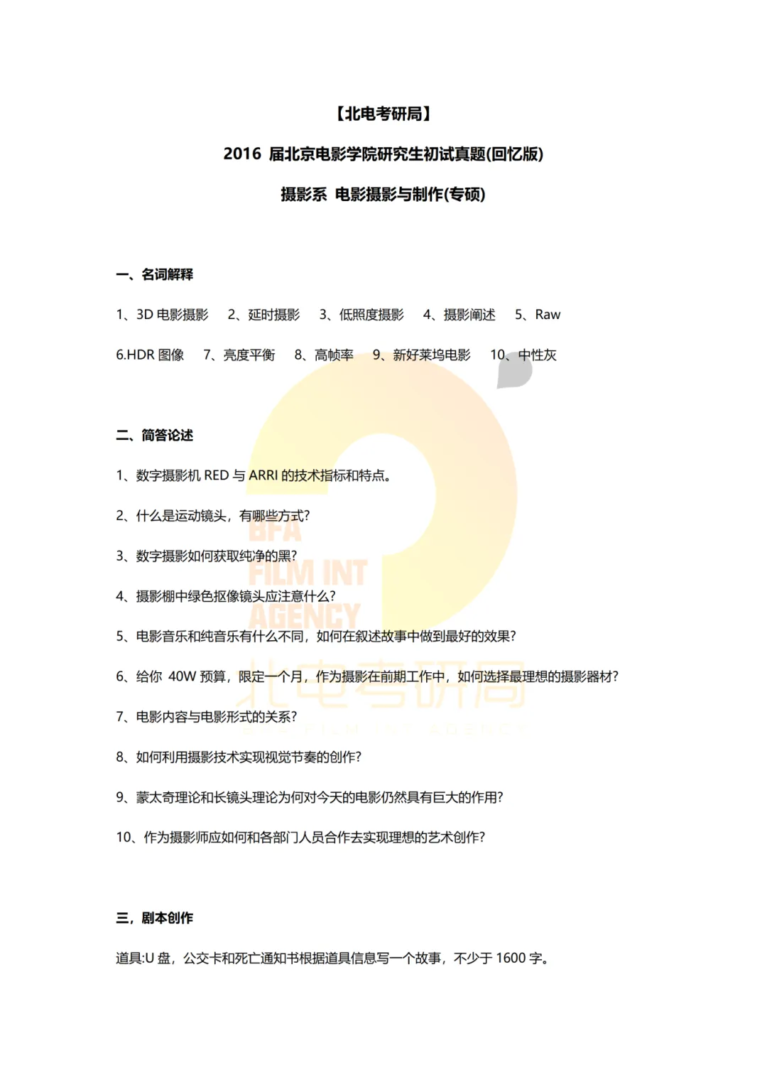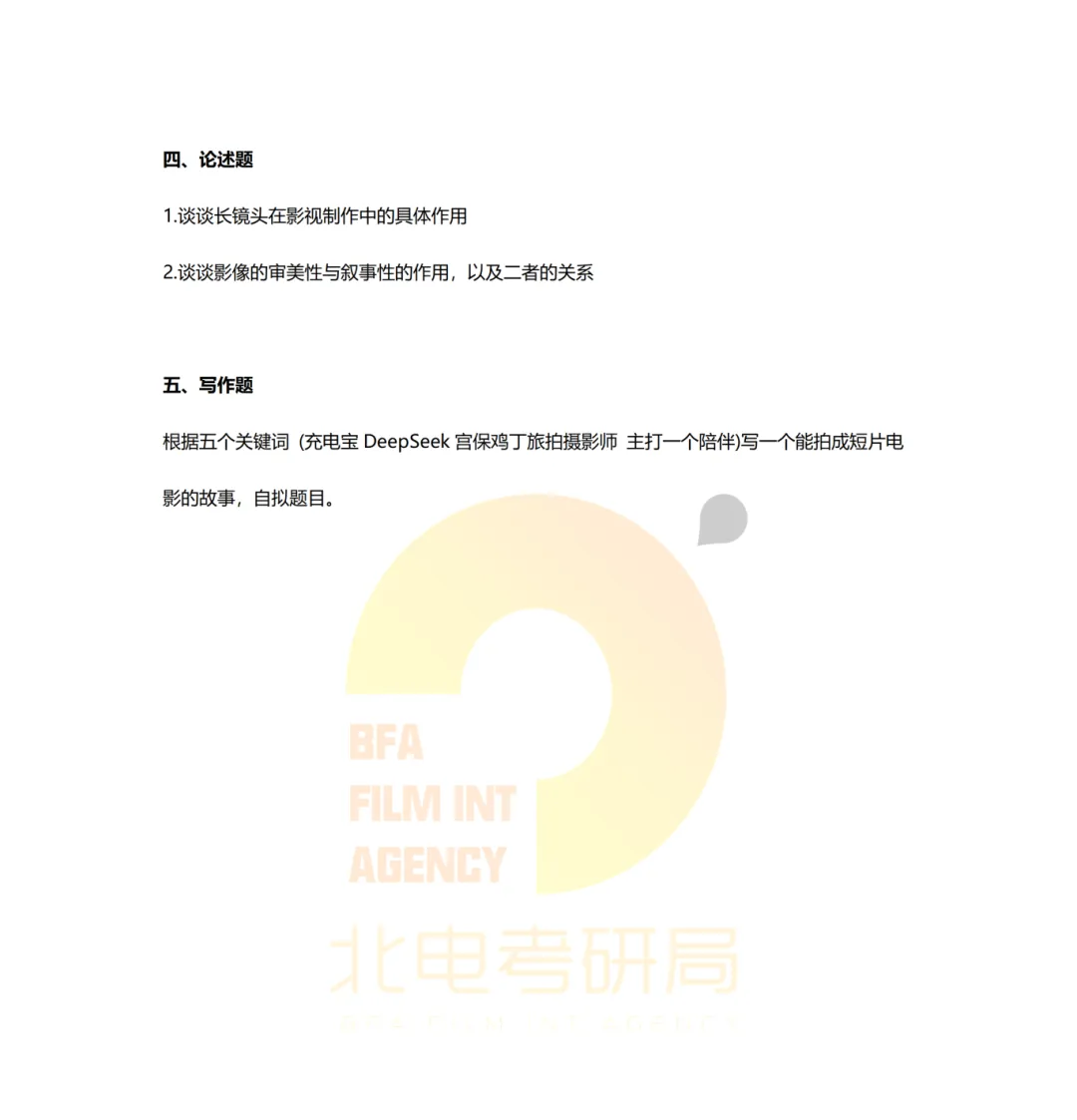 真题档案 | 北电考研摄影系—电影摄影与制作近十一年真题汇总!