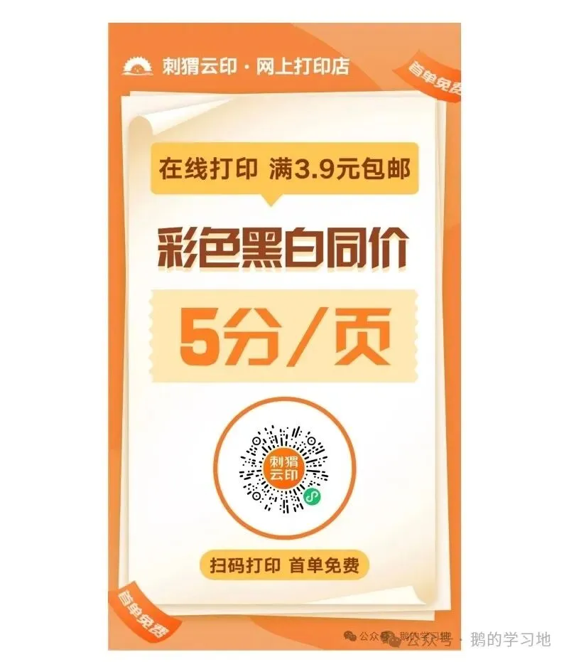 刺猬云印,黑白5每页,彩打7分起,满3.9包邮,次日达。需要大量打印资料的医学生可以收藏使用。如有问题可咨询客服。