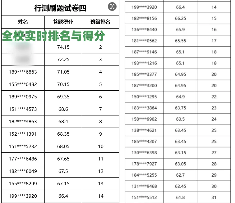 每次模考阅卷结束后,即时生成全校排名,看到自身在同期备考考生中的定位,对比排名。