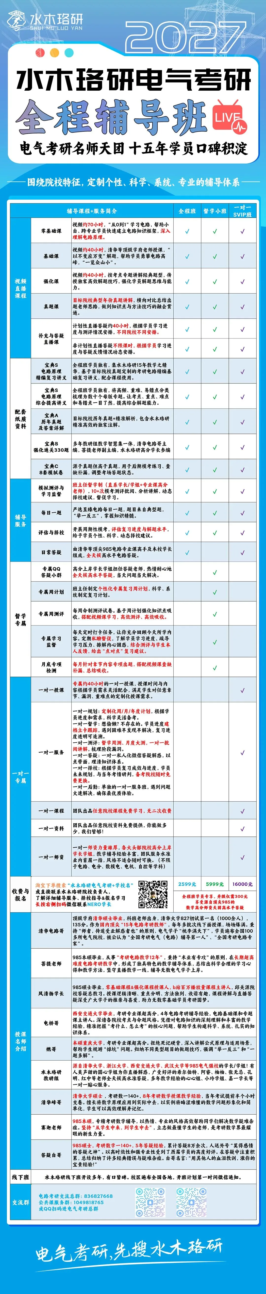 水木珞研电气考研教育辅导团队师资力量超300人,由清华电路哥、菩提老师、电分君、风清扬老师等一众名师领衔,积淀十余年辅导经验形成独具特色的教学辅导体系,累计辅导考生100000余人。在给予学生考研择校指导的同时,水木珞研提供从资料答疑班、全程辅导班、督学小班到SVIP名师一对一的多元辅导方案,为考生们提供多维度、复合型的个性化产品以供选择,服务从初试到复试电气专业全科目的全景辅导需求。