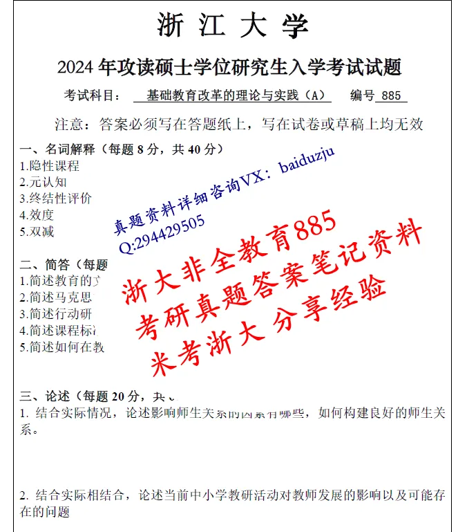 27浙江大学非全教育885基础教育改革考研真题答案笔记资料