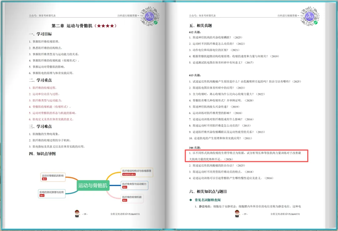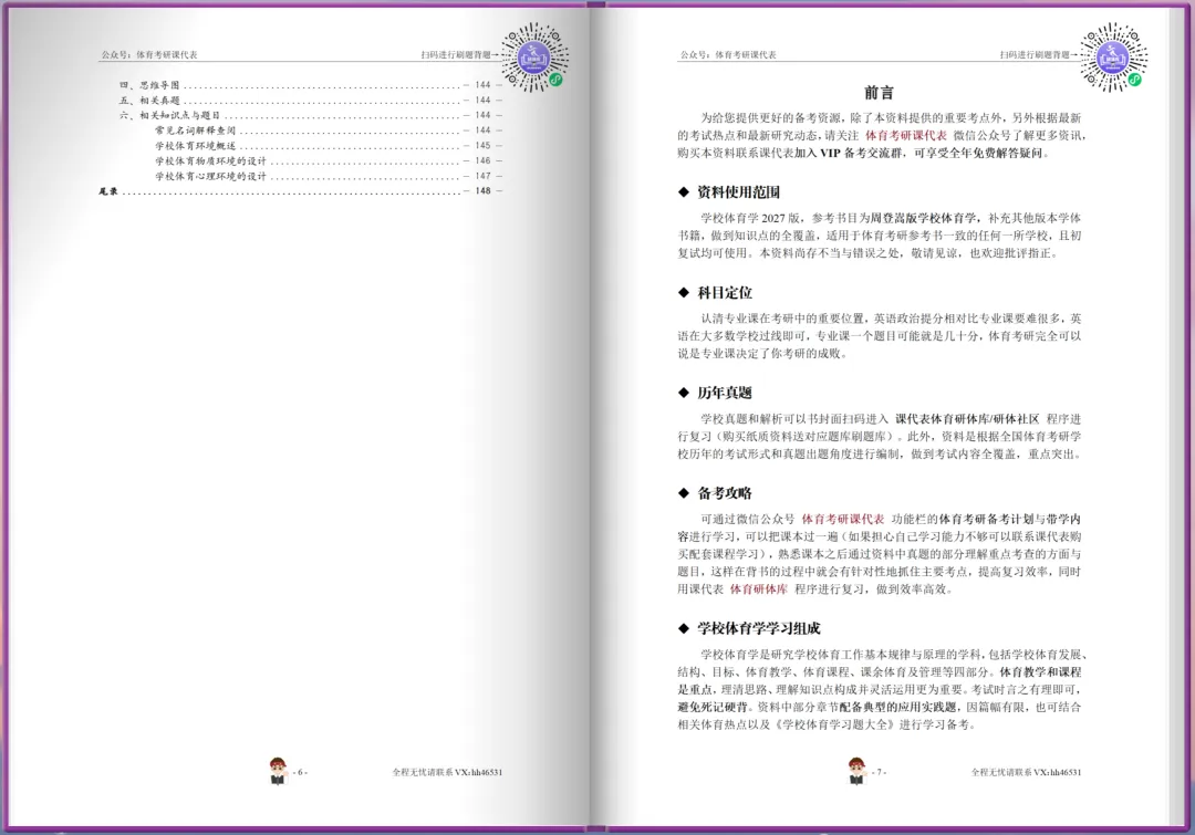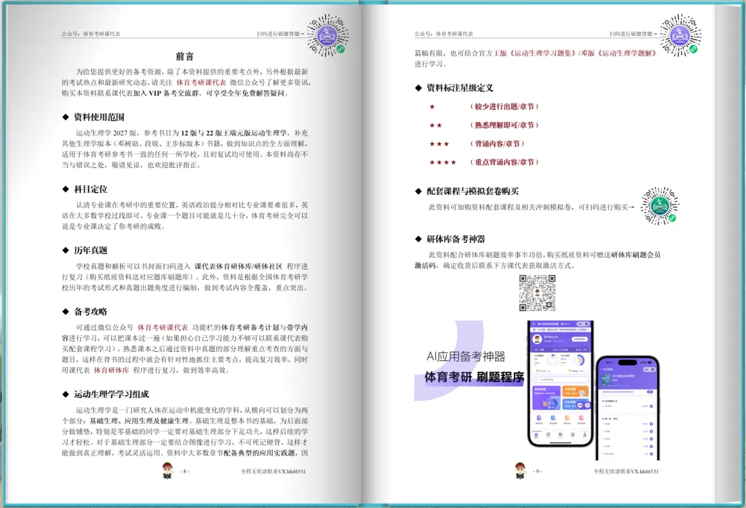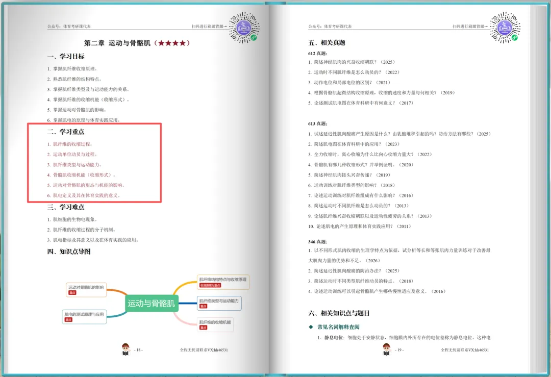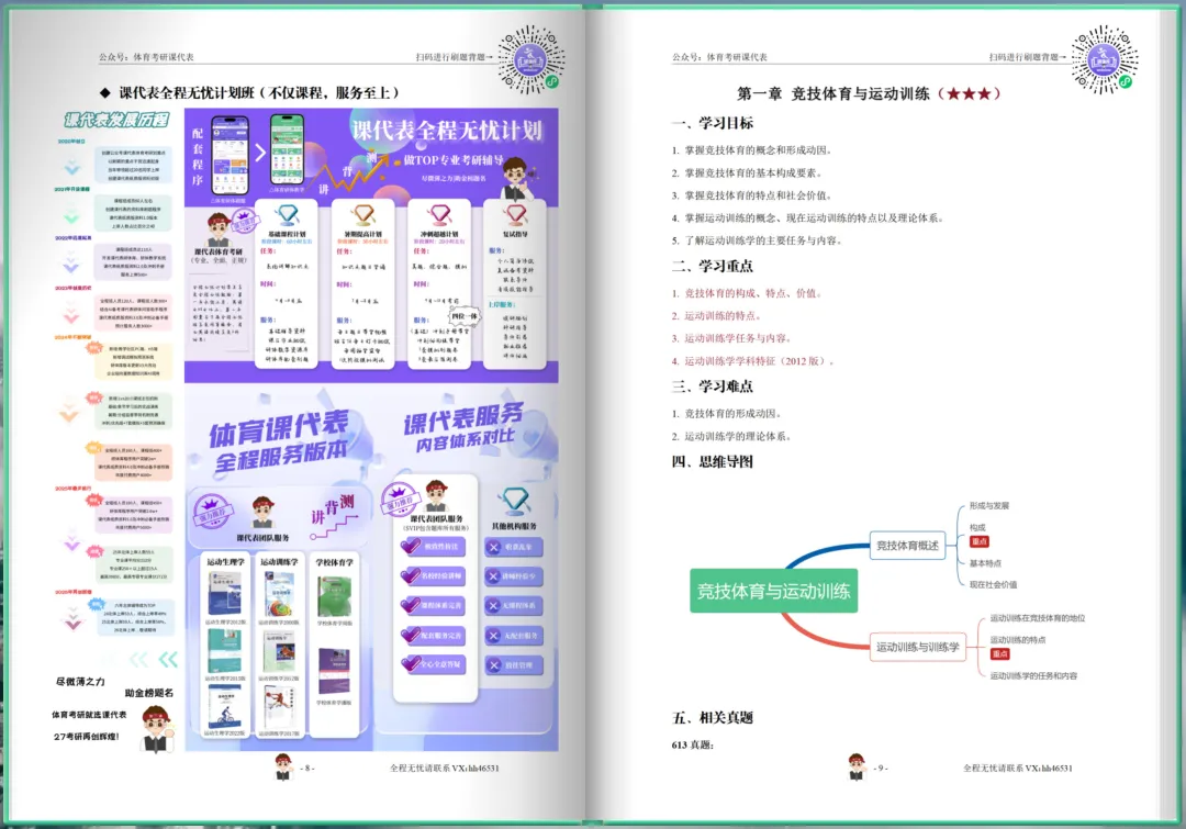 课代表辅导资料总体上分为基础辅导资料和冲刺必备手册,每年都会更新内容以及排版优化。基础辅导资料按章节每小节划分知识点并配备详细的思维导图、真题、名词解释汇总、知识点和相关考题真题,并配备研体库知识归纳进行线上学习,可下方扫码直达。冲刺必备手册按周计划进行,周计划一周计划六天,第七天为总结复习等任务,每周内容可搭配艾宾浩斯曲线进行记忆,事半功倍!可45天完成一轮系统背诵,同时研体库冲刺背题服务可实现线上多功能背题功能,同时配备带背视频课程更加高效背诵。