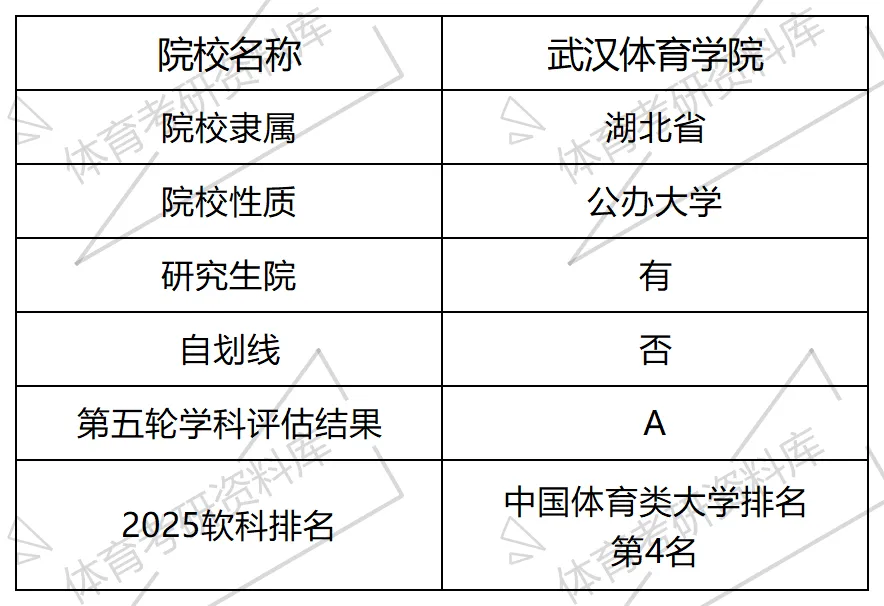 武汉体育学院原名中南体育学院,1953年成立于江西省南昌市,是新中国成立后首批独立设置的全日制普通高等体育院校之一。我校学科专业建设成绩显著,体育学一级学科优势突出,入选湖北省省属高校一流学科培育建设学科,在教育部历轮学科评估中均位居前列。我校研究生教育始于1960年,是全国最早培养体育学研究生的单位之一。现有体育学一级学科博士学位授权点1个,体育博士专业学位授权点1个,体育学、心理学、新闻传播学、艺术学、特种医学和工商管理等一级学科硕士学位授权点6个,体育硕士、应用心理硕士、新闻与传播硕士、舞蹈硕士、戏剧与影视硕士等专业硕士学位授权点5个。在校研究生2700余人,是全国硕士生培养规模最大、专业点最多的体育院校之一。