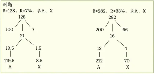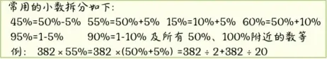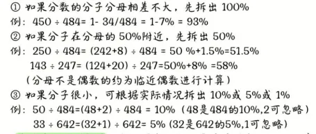 2. 乘法拆分:将百分数拆成50%、10%、5%等简单数值的和/差,分别相乘后再合并。(要善用一个包子思维)