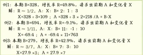 1. 核心:将增长率转化为分数m/n,基期A为n份,增长量X为m份,现期B为n+m份(R为负则X为负,作差)。