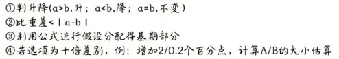 考法:求单一下增量(百化分用415份数法、R极小用X≈BR、其他用假设分配)、求增量比值(分别求X1、X2再作比)。
