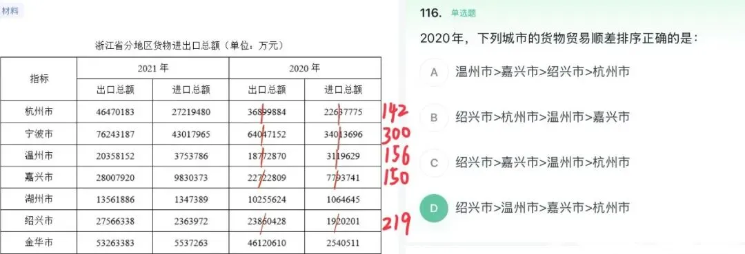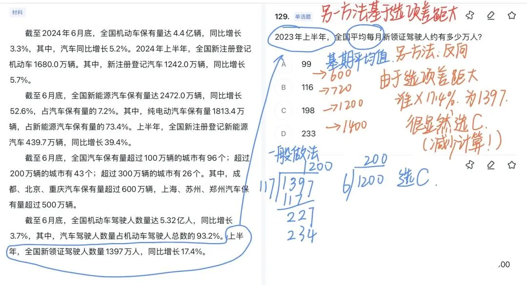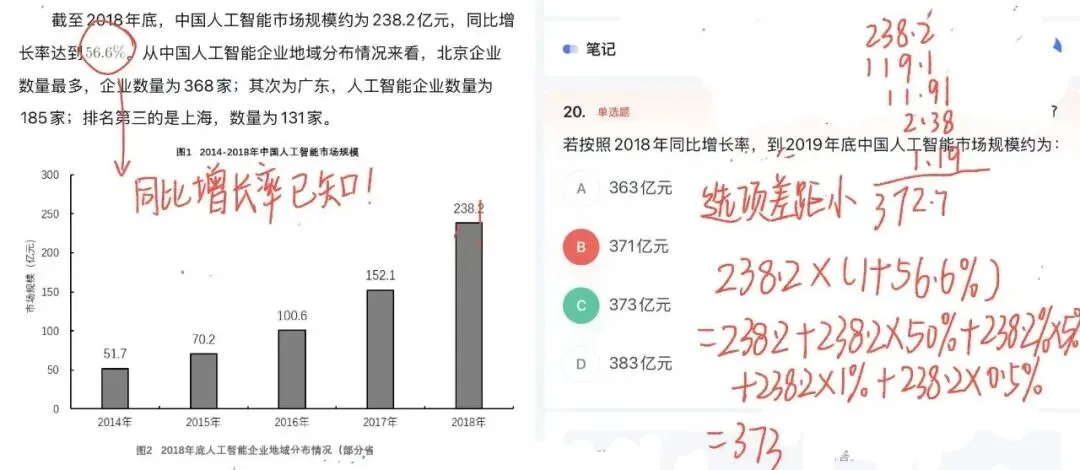 图中这种题,算出的比例值和原材料给出的比例值差距小,选项值差距也大。那么直接等比例放缩就可以得近似值,提升速度。