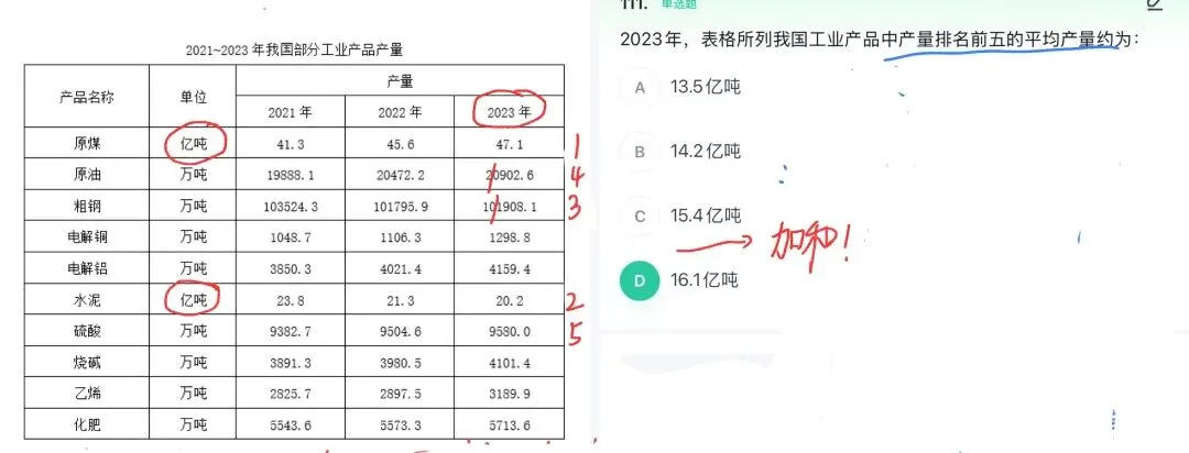注意表格题求和要看清楚单位!特别是把单位单独拿出来有一列的!图中的单位不是在表头,而是在每一主体后面单独有一列,这时候看了问题不要直接去找数据算,可能算出来是错的或者没答案,要去看一看单位是有不同的,换算成一样的。