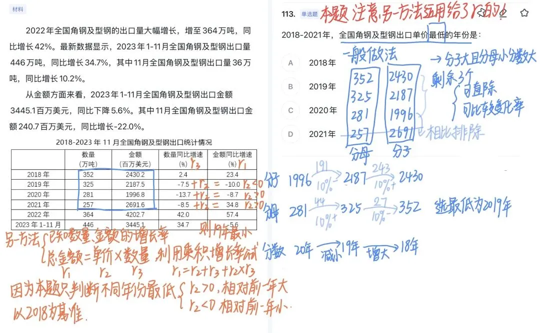 图中这题蓝色字是一般的做法,直除得到结果,再优化就是利用分子分母同比增长率比较分数大小。本题特殊在给了每年分子分母的同比增长率,那么利用乘积公式,选一个基准,反向推出平均数的同比增长率的正负,就可以得出平均数的大小变化。