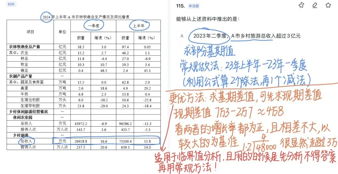 如图,一般算法就是蓝字部分,分别用除法算出总体和A的基期值,再用减法算出非A的值。红字和橙字部分就是算较为简单的方法,但是理解分析要知道,A与总体的变化是同向变化,且增长率相差不大。相差求的是差值,依照A的增长率来计算,恰好总体的增长率还小于A,那么实际的肯定比依照A算出来的大。如果遇到总体增长率比A大,那么就要估算一下差值,与结果相减,可能这种就不太实用。