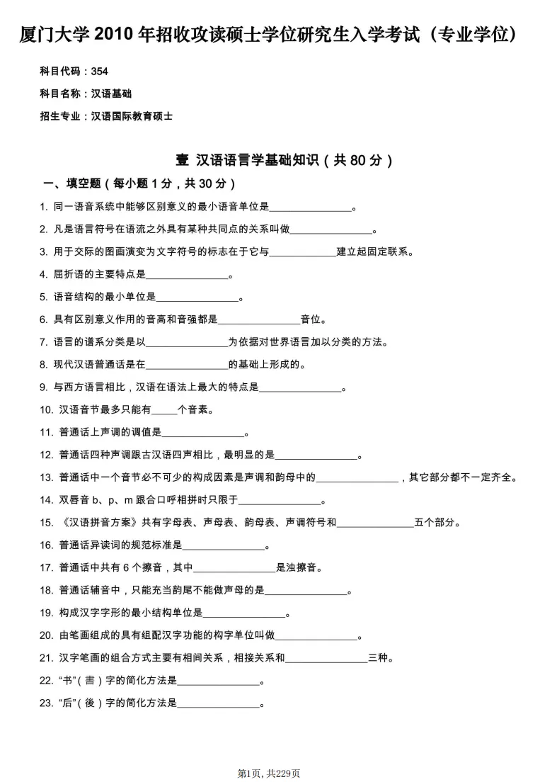 2010-2024年厦门大学354汉语基础考研真题试卷【近年回忆版,缺少部分题目】