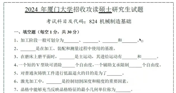 2024年厦门大学824机械制造基础考研真题试卷与答案