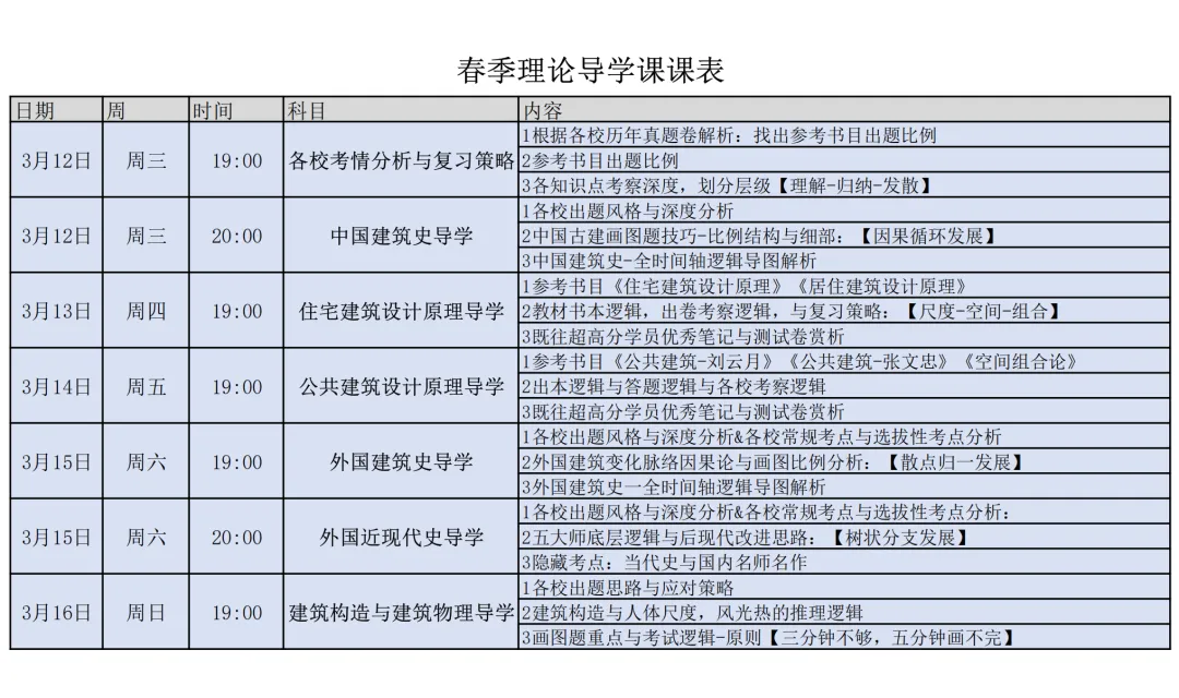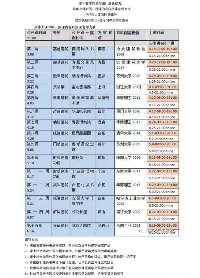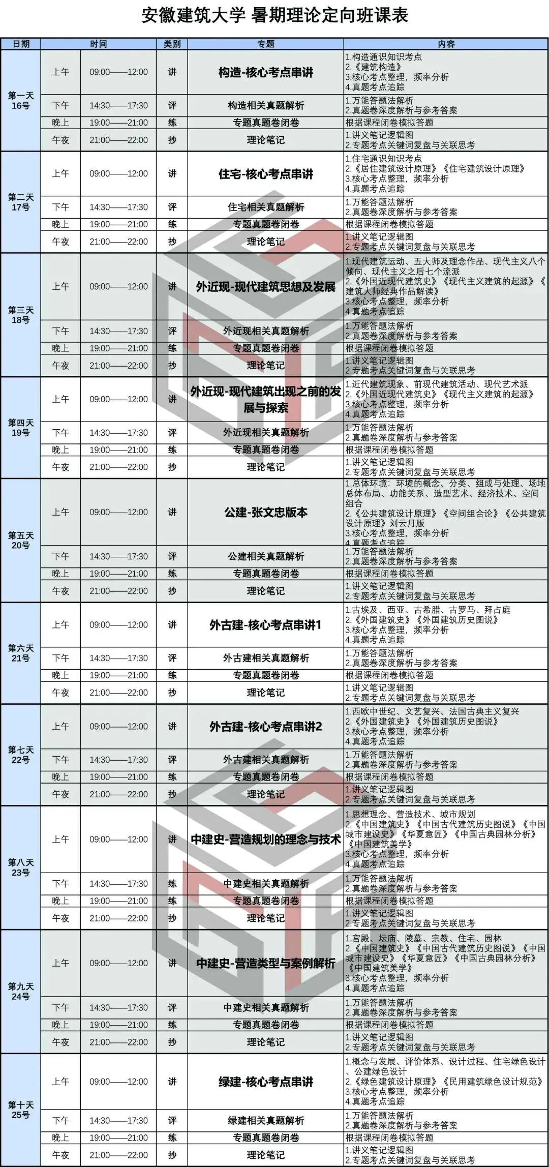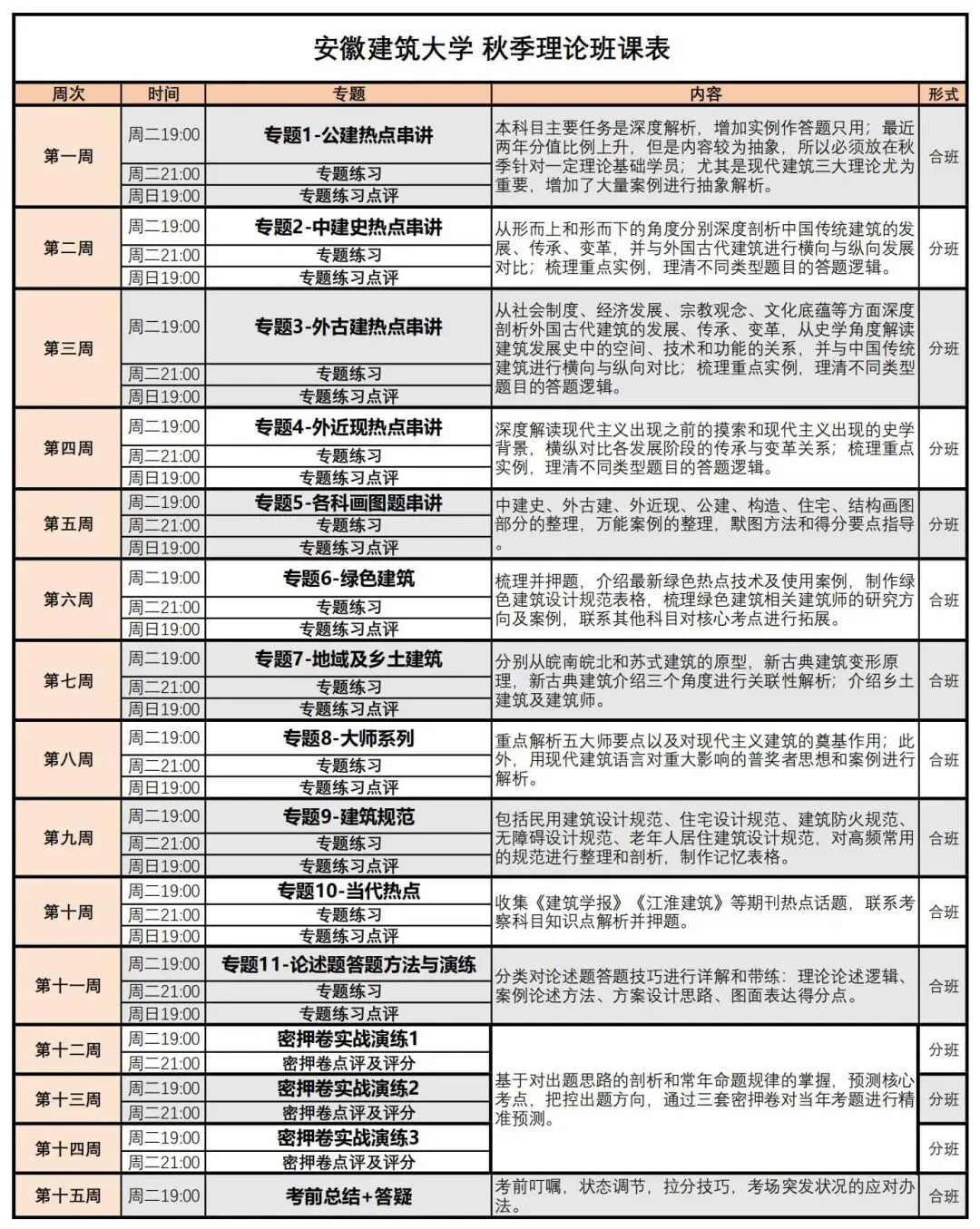 安徽建筑大学,考察内容比较广泛,其中公共建筑设计原理(7课时),住宅原理(5课时),建筑构造(3课时),参加春季公共课。规划原理只考古建筑保护以及城市更新,城市设计相关章节。其他如一些超纲题目,在秋季理论建筑热点进行讲解,具体春季上课根据课程进度结合大纲安排课程计划