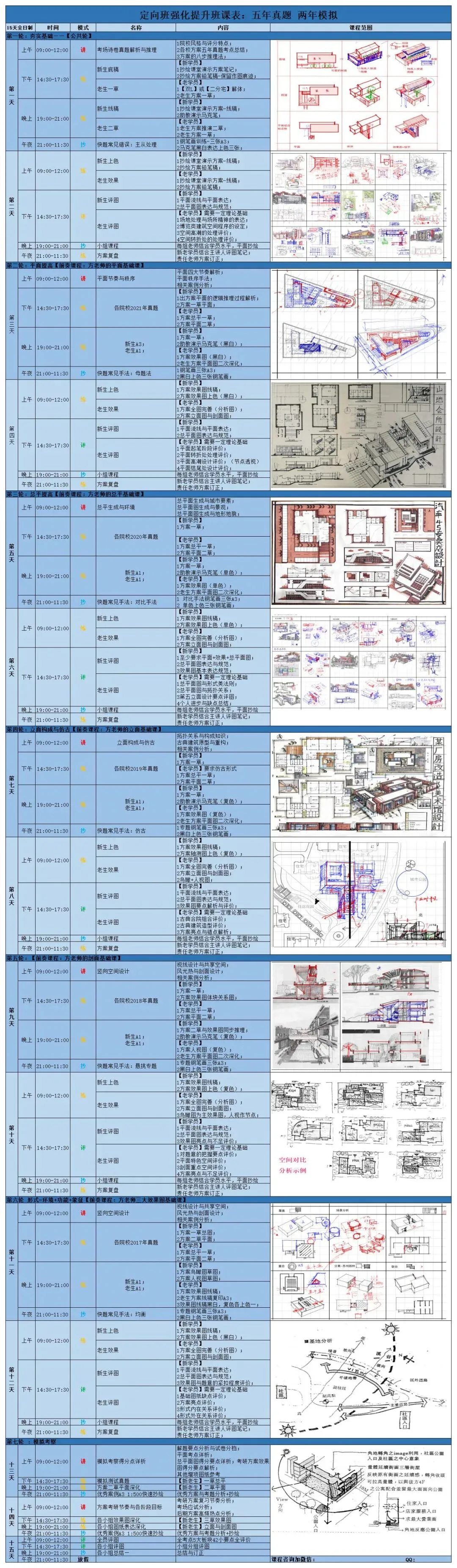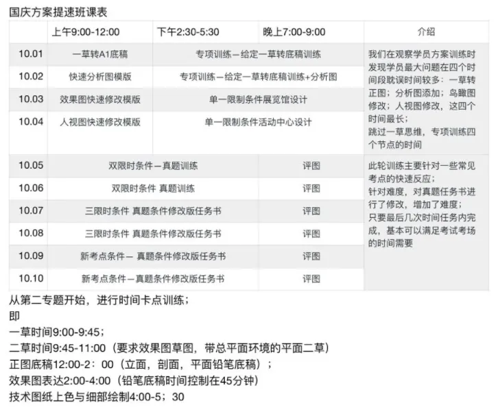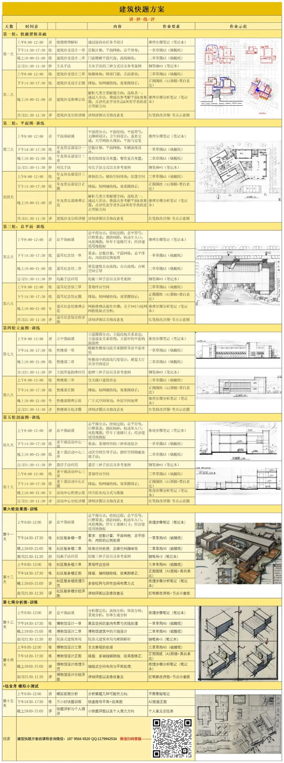 第4—10天(.10.04—10.10):依次对文化展览、民宿住宅、校园、体育、旅游度假、改扩建、绿色建筑等快题类型(大概率考察)进行练习和讲解。一天一张,白天画图,晚上集中讲解!注:期间针对快题考察方向分析、手绘技法表现及实际工程项目开展专题讲座。