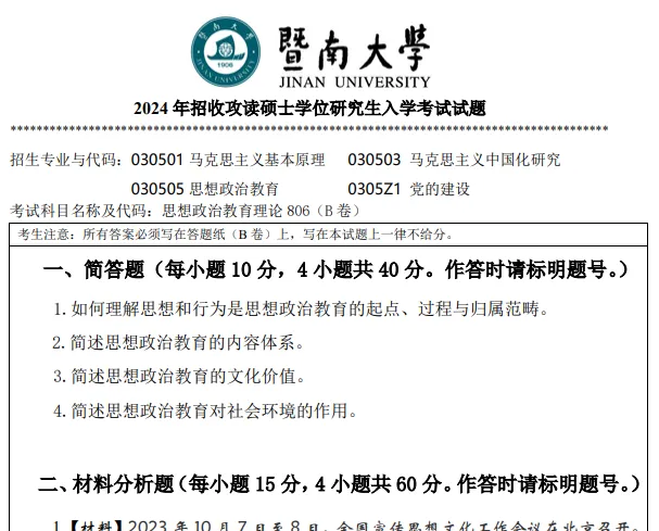 2010-2025年暨南大学806思想政治教育理论与实践考研真题试卷【电子版】