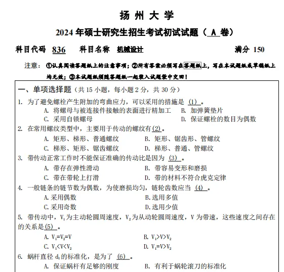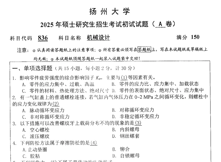 2014-2025年扬州大学836机械设计考研真题试卷