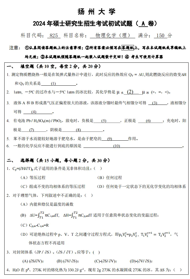 2004-2008,2014-2025年扬州大学825物理化学(理)考研真题试卷