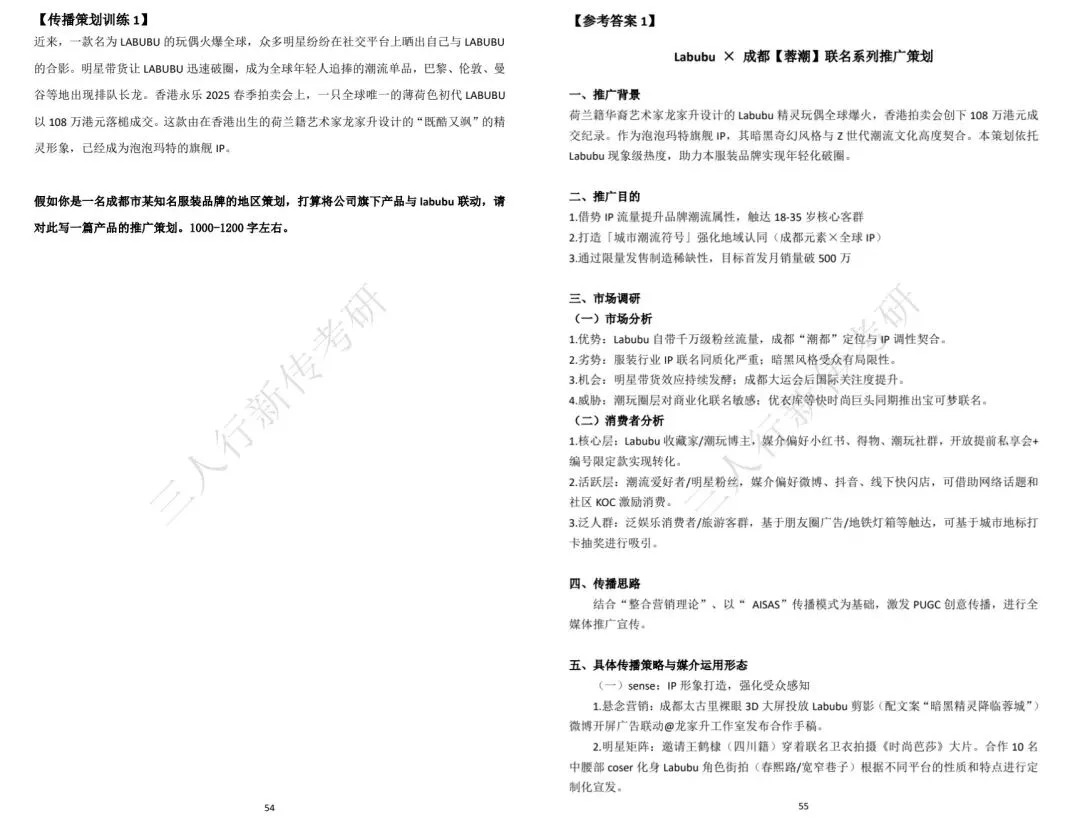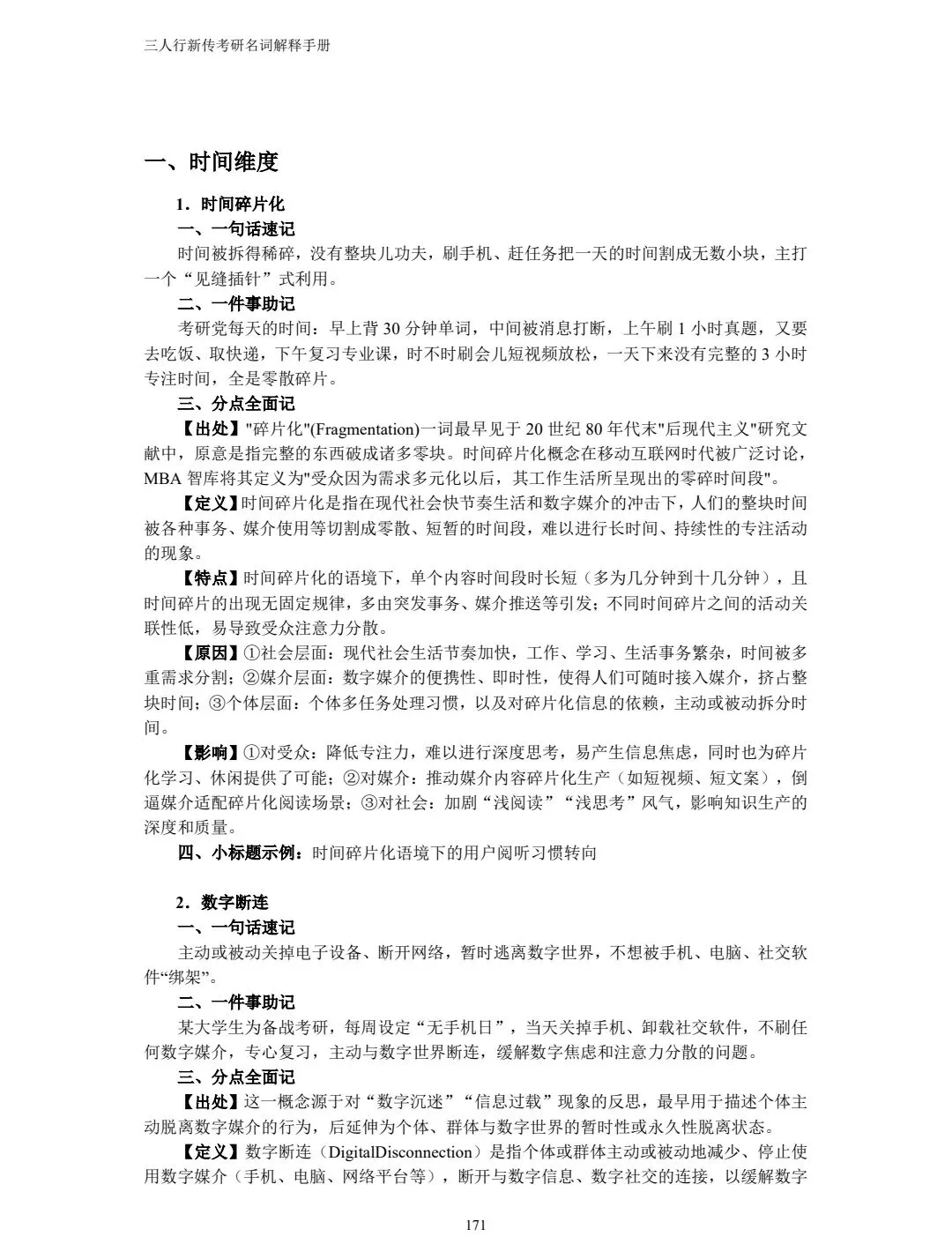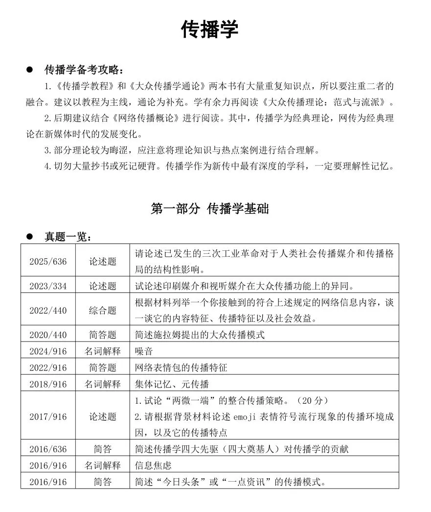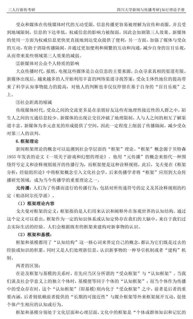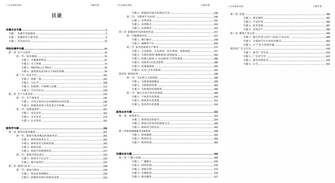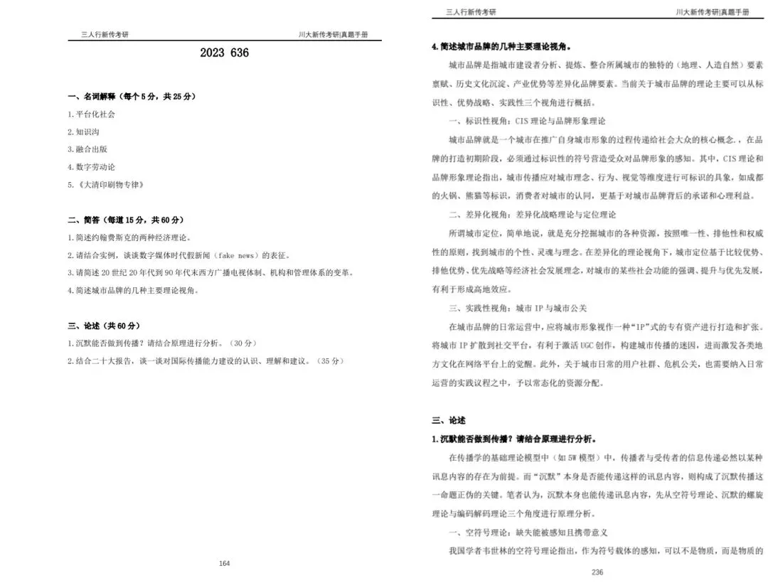 第一个板块(3-8月)由理论手册+业务手册、真题手册、名词解释手册和业务练习手册五本资料组成,主要用于辅助和强化基础知识的学习;第二个板块(9-12月)是专题手册,是对各个学科的重点、 考点和热点的整合,主要用于冲刺阶段的知识整合和深化。理论笔记:包括传播学、新闻学、网络传播学、新闻史、符号学五大板块的参考书重点知识笔记整合业务笔记:包括新闻业务(新闻采写、新闻评论、新闻编辑、新闻策划)和传播业务(编辑出版、广电摄影、广告营销、媒介产业运营)两大板块的重点基础知识整合这两本笔记资料除主体知识点内容外,学长锦囊(关于知识点延伸、学习方法等的额外提醒)、真题一览、真题导向、学习攻略、知识框架(在此基础上可以自行细化加工)等。(1)看真题是为了感受川大的出题风格和走向,领悟川大喜欢出什么类型的题目,哪些知识点是重点,用真题来做复习的导向,避免努力错方向。(2)看真题是为了领悟参考答案(ps.此资料所有答案皆为三人行的学长学姐查阅资料和文献并结合自己的答题经验整理所得,并不是标准的参考答案,川大不提供试题参考答案),从参考答案中学习答案的排版布局、语言风格、逻辑思路和小标题的提炼等。(3)同时,不管是专硕还是学硕的考生,都建议将每一道真题都独立自主地练习一遍。包括川大新传考研专硕和学硕近九年来(2018年—2026年)的真题及参考答案。以2023年636的真题为例:(1)输入:文科的学习输入非常重要,积累语料观点,让你的答题语言更具专业性和学术性而不是大白话,而记背名词解释就是基本的输入方法。(2)积累:新传考研的参考书非常多,知识点也非常多,所以必须要分到平时来慢慢消化,短时间冲刺是消化不完的,只有长时间积累才是王道。(3)由点到面:名词解释相当于点,将一个个点记背之后建立联系,就相当于把点串成面,把零碎的点连成知识体系,进而对整个参考书有更透彻的理解。我们的名词解释手册包括传播学、网络传播学、新闻学、新闻史、符号学、拓展理论六大板块,总计500多个名词解释(新闻业务与传播业务的名词解释已经合并到业务手册,帮助大家减负)。具体又包括每个学科名词解释的思维导图与每个名词解释的具体背诵内容。本资料对不同重要度的词条都予以了区分标注,其中标注【理解】类的词条总体上偏基础或边缘,在当前直接考察的可能性相对偏低,所以只需要理解并掌握大致意思即可;而标注【记忆】类的词条则要求重点掌握和背记,不仅论述要更加完备,而且附注了【一句话速记】【一件事助记】【小标题示例】等内容辅助理解和记忆,降低输入成本。以今年重点新增的拓展理论部分为例:(1)不管是专硕还是学硕,业务实操题为每年必考题,尤其是新闻评论。并且业务实操题分值较大,因此必须单独集中训练。(2)对于跨考生来说,之前都没有专门进行过新闻业务的练习,因此实务写作是一个薄弱点。(3)新闻业务必须要动笔写,每个人至少要进行15次以上的训练才能具备应试素养。【业务狂练手册】主要分为两大板块:前半部分是对每种业务类型的讲解,并提供一些基本的写作模板;后半部分时针对今年热点的题目和参考范文。具体包括新闻评论、媒介批评、新闻策划、传播策划、消息改写、标题撰写六大板块,每个板块会提供3道左右的练习题目。(备注:该资料要根据每年热点动态换选题,因此是唯一的电子版资料,目前尚未更新,以下截图为去年的题目)9-12月的备考时间是非常关键的,9月之前我们主要是在慢慢地打基础,9月之后就得换一种思路了,得快速成长。快速成长的最好方式就是整理专题。一是新传的知识点太零碎太繁杂了, 而专题就是一种化零为整化繁为简的方式,让零碎繁杂的知识点变得更加清晰、简洁和完整;二是通过专题的整理和学习,可以起到锻炼思维、积累案例语料、接触前沿热点的作用;三是因为新传的考题往往不限于书本,到后期需要我们根据热点加以延伸拓展。这套资料主要是将川大新传的各科重要知识按照专题的逻辑进行了重组和整合,一共包括网络传播学专题、新闻学专题、新闻业务专题、传播业务专题四大板块,总计450页左右。具体的专题内容见下面的目录:(这是去年的目录,该资料9月之后才开始寄送,会按照今年的热点考点进行改变调整) 1. 全套资料:原价568元,关注“三人行新传考研”公众号并加入27川大新传考研交流群(见推文开头和结尾)可优惠20元;2.基础阶段资料(包括理论笔记手册+业务笔记手册、真题解析、名词解释手册和业务练习手册):440元,也可享受上述优惠。3. 冲刺阶段资料(即专题手册):9月单买148元,与全套资料一起购买128元。注:(1)资料不单卖;(2)预售资料:名词解释手册、真题解析、重点笔记的发货时间为3月底左右,业务练习手册6月底开始提供电子版,专题手册于9月更新重编完成后寄送;(3)下单全套资料即送一份精美文创。送福利:一对一定制规划答疑