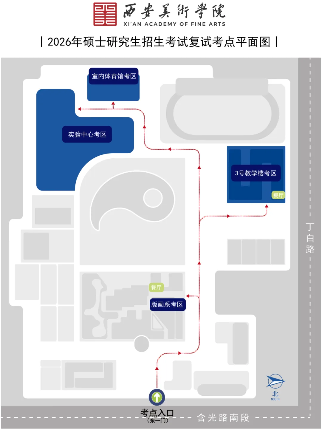 考生凭初试准考证和身份证,由西安美术学院雁塔校区东一门(含光路)人行通道进出考点。