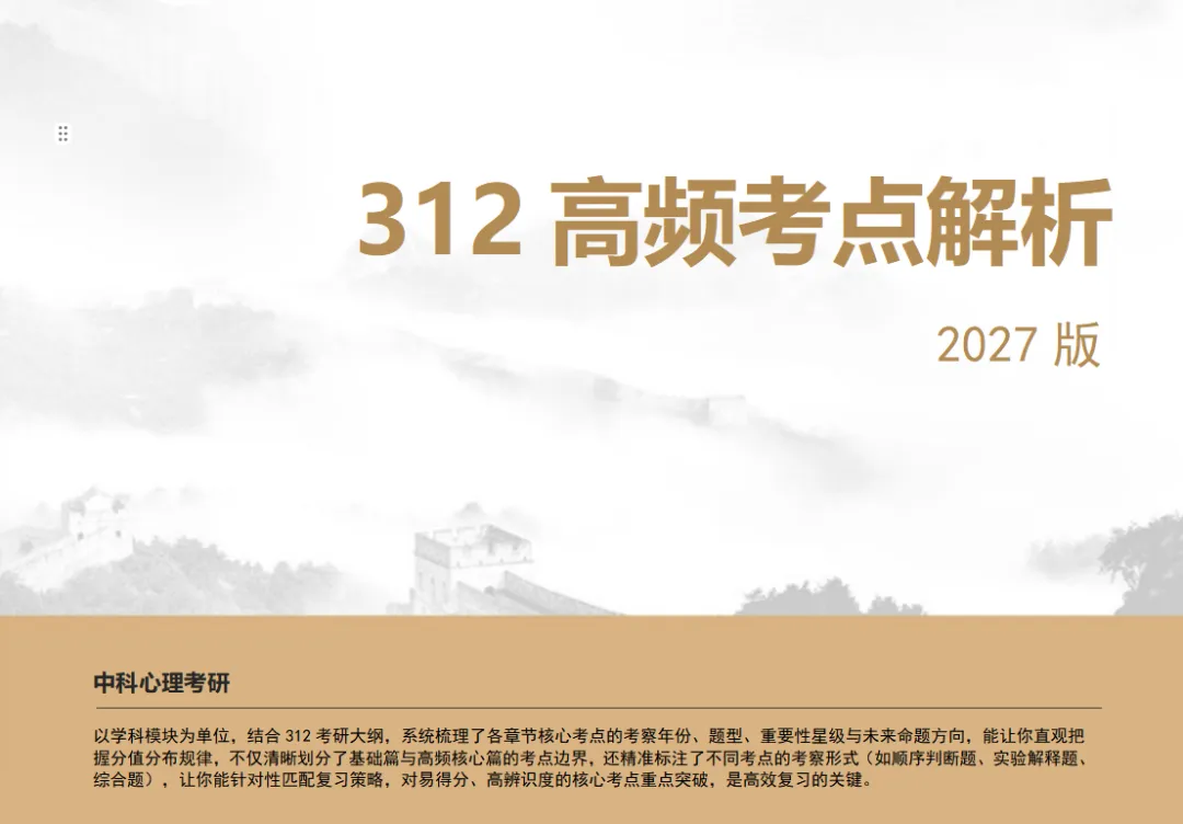 哈喽,各位27考研的宝子们,如果你们正在备考312的话,一定要来看一眼我们今年的5件套哦!不管你是否备战中科院心理所的312,我们的资料就是为统考而备!因为,市面上存在很多成熟的312复习资料,那么我们要做的就是主打差异化、高效化。以学科模块为单位,结合312考研大纲,系统梳理了各章节核心考点的考察年份、题型、重要性星级与未来命题方向,能让你直观把握分值分布规律,不仅清晰划分了基础篇与高频核心篇的考点边界,还精准标注了不同考点的考察形式(如顺序判断题、实验解释题、综合题),让你能针对性匹配复习策略,对易得分、高辨识度的核心考点重点突破,是高效复习的关键。