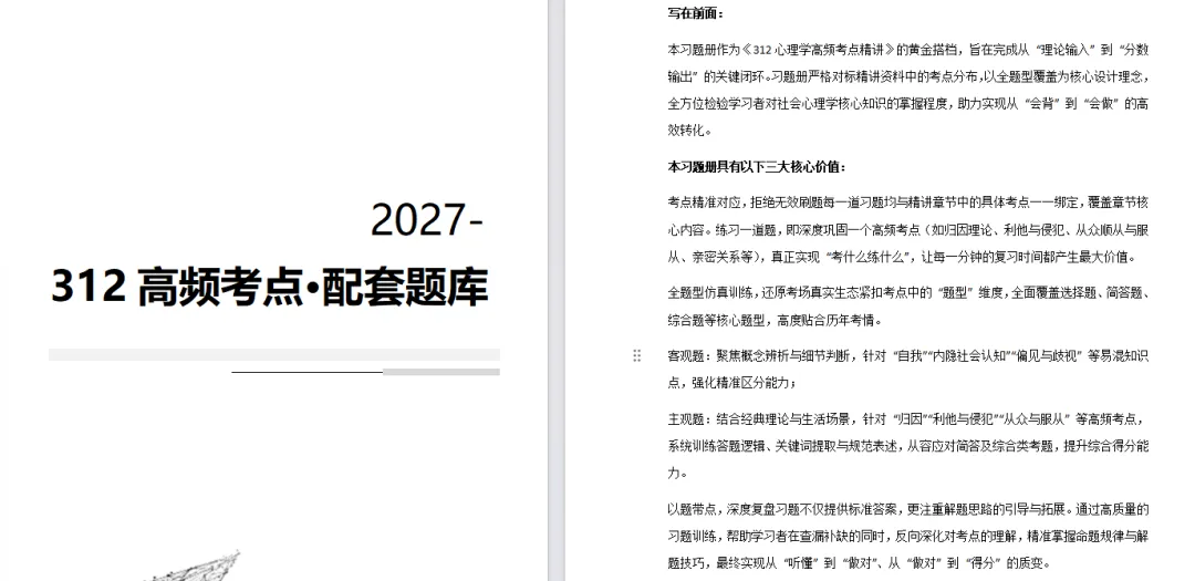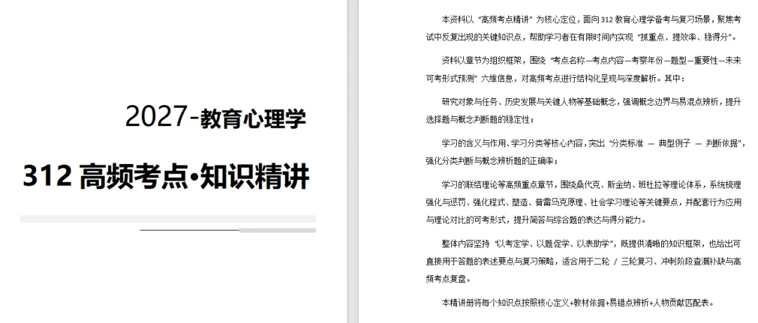 本资料以“高频考点精讲” 为核心定位,面向312心理学备考与复习场景,聚焦考试中反复出现的关键知识点,帮助学习者在有限时间内实现“抓重点、提效率、稳得分”。