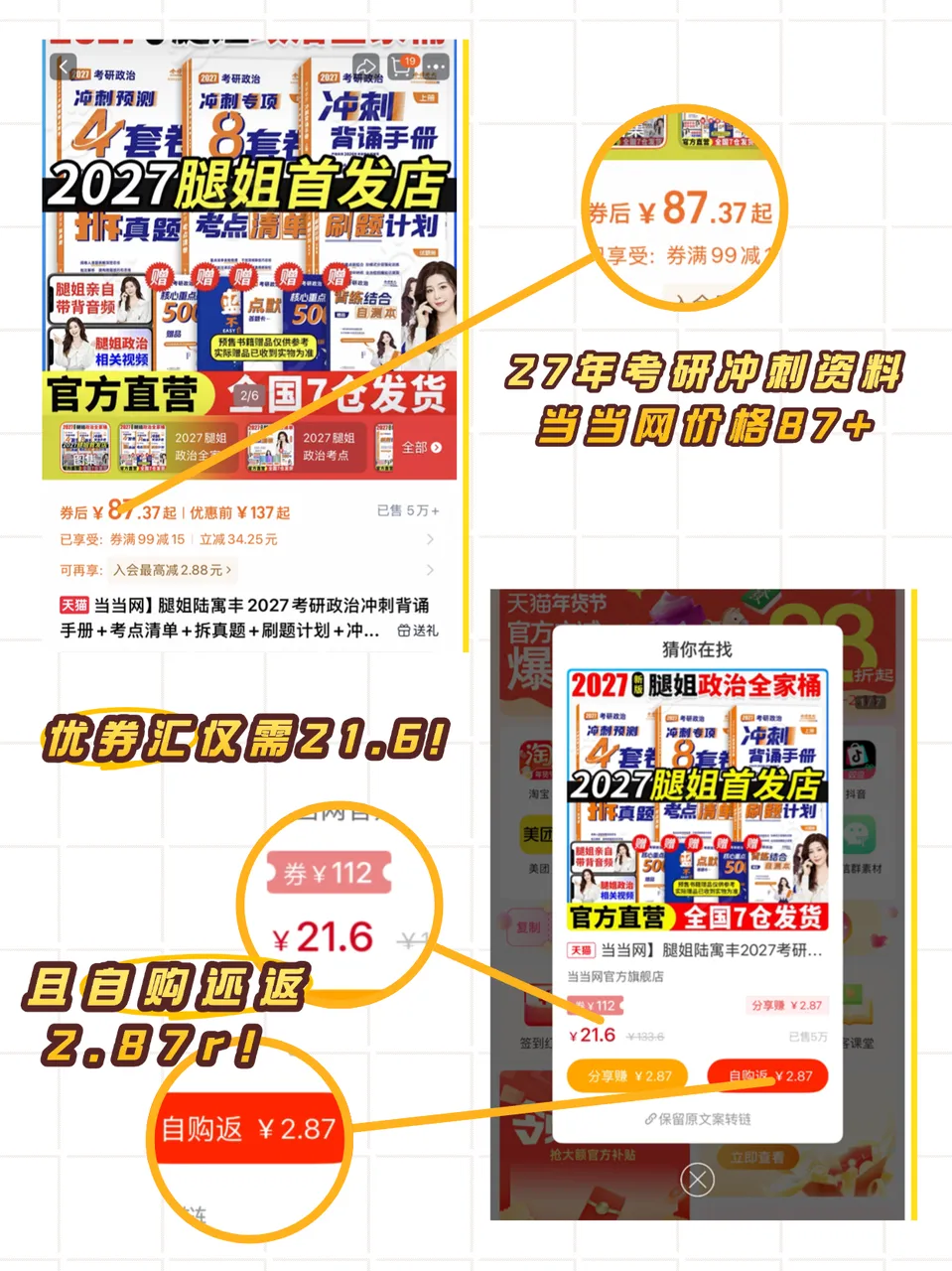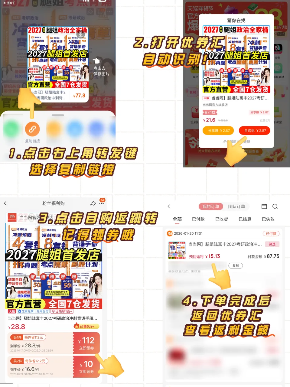 以前买考研资料就是直接下单,完全不知道购物返利这回事。后来发现优券汇,才明白能省一点是一点,备考党也能薅羊毛